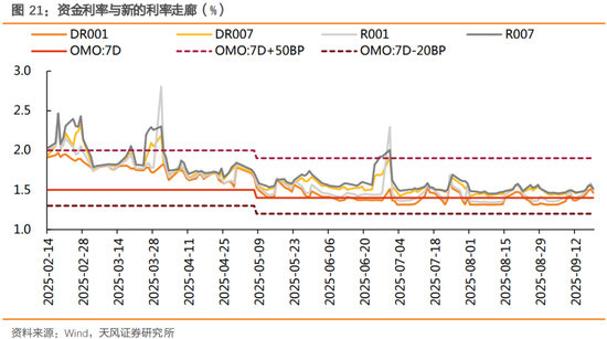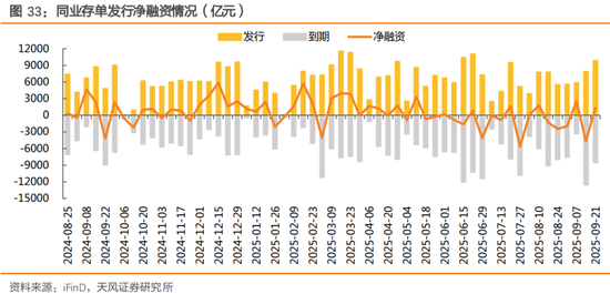(3)货币市场:国有大行净融出回落。资金利率大幅上行,截至9/19,相较9/12,DR001上行9.98BP至1.46%,DR007上行5.21BP至1.51%,R001上行10.14BP至1.5%,R007上行5.09BP至1.52%;银行体系资金净融出平均2.74万亿元,较上周变动-3772亿元。其中,国有大行净融出平均3.48万亿元,较上周变动-2646亿元,隔夜占比97%,较上周变动-0.53%。