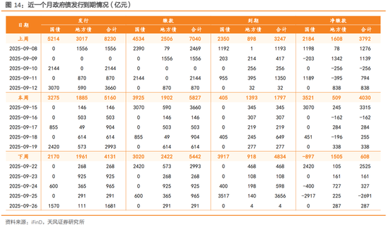 (2)政府债:下周发行规模回落。下周,政府债拟发行4131亿元,其中,国债发行2170亿元、地方债发行1961亿元,国债到期3917亿元、地方债到期918亿元,国债净缴款-897亿元、地方债净缴款1505亿元。